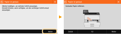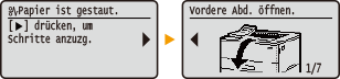 In manchen Fällen werden bei einem Problem Anweisungen angezeigt, wie auf das Problem reagiert werden soll. Befolgen Sie zum Beheben des Problems die Bildschirmanweisungen. Im Folgenden sehen Sie als Beispiel den Bildschirm, der bei einem Papierstau angezeigt wird.