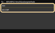 2 | Wählen Sie eine Verschlüsselungsmethode aus. ![]() <Auto> Das Gerät wählt automatisch AES-CCMP oder TKIP, je nach der Einstellung am Wireless LAN-Router. <AES-CCMP> Stellt AES-CCMP als Verschlüsselungsmethode ein. |