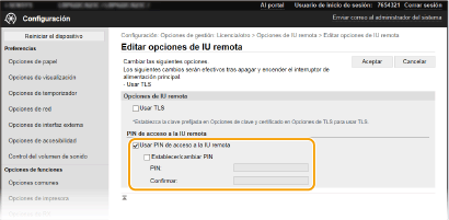 ![]() Uso del panel de controlTambién es posible ver las opciones de PIN para acceder a la IU remota desde <Menú> en la pantalla Inicio. <Opciones de IU remota> Si se inicializan las <Opciones de gestión>El PIN de acceso a IU remota también se inicializará. Tras una inicialización, vuelva a establecer el PIN. <Inicializar menú> |