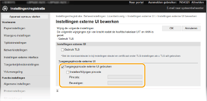 ![]() Wanneer Afdelings-ID beheer is ingeschakeld, is deze instelling niet vereist. Afdeling-ID beheer configureren Voor meer informatie over de basishandelingen die moeten worden verricht wanneer u het apparaat instelt via de externe UI, raadpleegt u Menuopties instellen via de UI op afstand. |