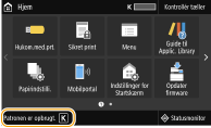 Når der vises en meddelelse Når du udskriver, kan du fortsætte med at udskrive originalen. Hvis der vises en meddelelse, mens der modtages en I-fax, vil maskinen ikke udføre udskrivningen, så der kan undgås en uklar udskrift. For at fortsætte med udskrivningen, også selv om den resterende mængde i tonerpatronen er lav, skal du indstille <Forts. udskr. ved patron lav>/<Fortsæt print, når patron er lav> til <Til>. <Forts. udskr. ved patron lav>/<Fortsæt print, når patron er lav>Angiv, hvornår en meddelelse vises |