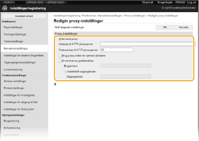 Du kan angive eller ændre adgangskoden for proxygodkendelse, når den er aktiveret, ved at markere afkrydsningsfeltet og indtaste alfanumeriske tegn for den nye adgangskode i tekstfeltet [Adgangskode].