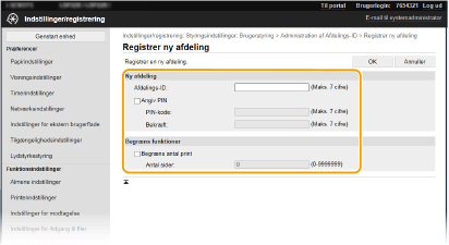 Registrer et afdelings-id og konfigurer en pinkode for det. Registrer alle de afdelings-id'er, der skal administreres.