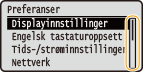 Du kan endre en rekke skjermrelaterte innstillinger, som skjermspråket: <Displayinnstillinger> Du kan endre hvilken skjerm som automatisk vises når maskinen står inaktiv i et angitt tidsrom: <Funksjon etter auto-nullstilling> Du kan endre en rekke innstillinger for tilgjengelighet, som rullehastighet: <Tilgjengelighet> |