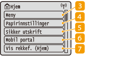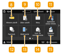 ![]() | <Minnem.utskrift>Skriver ut filer lagret på en USB-minneenhet. Skrive ut fra en USB-minneenhet (utskrift fra minnemedia) <Sikker utskrift>Bruk denne funksjonen til å skrive ut et sikret dokument. Skrive ut et dokument som er sikret med en PIN-kode (konfidensiell utskrift) <Meny><Funksjonsinnstillinger>, <Preferanser> og mange andre maskininnstillinger har utgangspunkt fra denne knappen. Innstillingsmenyliste <Application Library-veiledn.>Viser en beskrivelse av Application Library (Applikasjonsbibliotek). <Papirinnst.>Denne knappen brukes til å angi format og type for papiret som er lagt inn i papirskuffen og flerfunksjonsskuffen. Spesifisere papirformat og -type <Mobil portal>Bruk dette for å opprette en direkte trådløs tilkobling til en mobilenhet. Koble til med mobile enheter <Innst. for startskjermbilde>Lar deg endre rekkefølgen for knappene på Hjem. Tilpasse Hjem-skjermen <Oppdater fastvare>Lar deg oppdatere fastvaren via Internett. Oppdatere fastvare |
