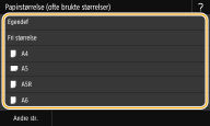 Hvis skjermbildet vist over ikke vises når papir er lagt innHvis du alltid legger i samme papir i flerfunksjonsskuffen, kan du hoppe over innstilling av papir ved å registrere papirformatet og -typen som standardinnstillingen. Når standardinnstillingen er registrert, vises derimot ikke skjermbildet vist over. For å vise skjermbildet, velger du <Angi når papir lastes> (Registrere standard papirinnstillinger for flerfunksjonsskuffen). |
