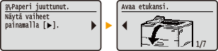 Joissakin tapauksissa, kun tapahtuu virhe, näytetään ohjeet virheen korjaamiseksi. Ratkaise ongelma noudattamalla näyttöön tulevia ohjeita. Alla näytetään esimerkkinä näyttö, joka tulee esiin, kun tapahtuu paperitukos.