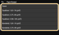 Jos lisättävää paperia täytyy vaihtaa usein, valitse <Vapaa>; se vähentää asetuksen muuttamiseen jokaisella kerralla tarvittavien vaiheiden määrää. Huomaa kuitenkin, että tämä asetus antaa laitteen tulostaa, vaikka tulostinajurin paperityyppiasetuksen ja laitteeseen lisätyn paperityypin välillä olisi ristiriita.