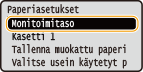 Voit tallentaa oletuspaperiasetukset monikäyttötasoa varten. Oletusasetusten tallentaminen säästää vaivaa, kun sinun ei tarvitse määrittää asetuksia aina, kun lisäät samaa paperia monikäyttöalustalle.