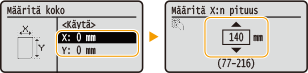 2 | Määritä <X>-sivun ja <Y>-sivun pituus. Kosketuspaneelimalli Valitse <X> tai <Y> ja syötä kunkin sivun pituus numeronäppäimillä. Mustavalkoinen LCD-malli |