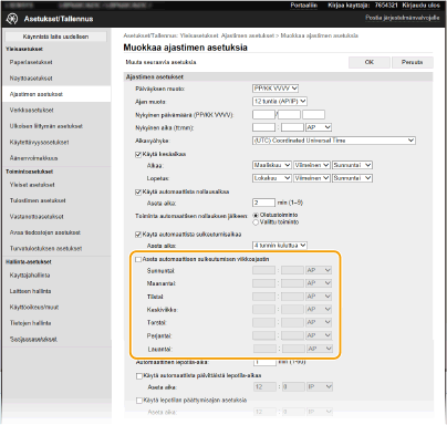 Valitse asetuksen [Aseta automaattisen sulkeutumisen viikkoajastin] valintaruutu ja määritä virran katkaisuaika.
