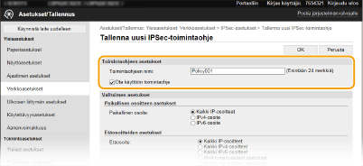 [IPv4:n manuaaliset asetukset] | Valitse tämä, kun haluat määrittää yksittäisen IPv4-osoitteen tai IPv4-osoitealueen, johon IPSec-protokollaa käytetään. Syötä IPv4-osoite (tai osoitealue) [Manuaalisesti asetettavat osoitteet] -tekstiruutuun. |
