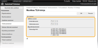 Voit salata tiedonsiirron laitteen ja tietokoneen selaimen välillä käyttämällä TLS:ää (Transport Layer Security). TLS on mekanismi, jolla verkossa lähetetty tai vastaanotettu data salataan. TLS:n täytyy olla käytössä, kun etäkäyttöliittymää käytetään seuraavien asetusten määrittämiseen: IPSec (Esijaettu avain -menetelmä), IEEE 802.1X-todennus (TTLS/PEAP) tai SNMPv3. Jotta voit käyttää TLS-salattua tiedonsiirtoa etäkäyttöliittymässä, sinun on määritettävä avain ja varmenne (palvelinvarmenne) ja otettava TLS käyttöön. Luo tai asenna TLS:n avain ja varmenne ennen TLS:n käyttöön ottamista (