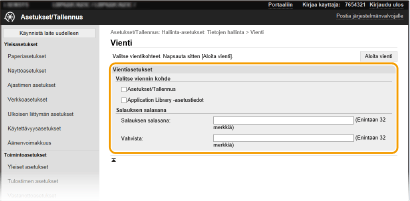 Valitse vietävät asetukset ja määritä salauksen salasana.