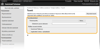 Valitse valintaruutu, kun haluat tuoda Application Library (Sovelluskirjasto) -asetustiedot.