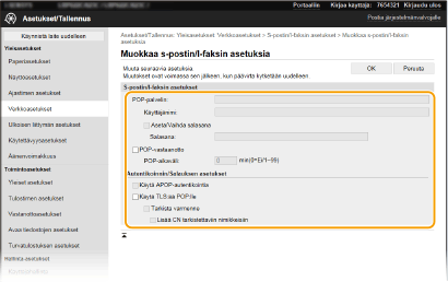 Käytettävän verkon mukaan POP3-porttiasetusta täytyy ehkä muuttaa ( Porttinumeroiden muuttaminen). Lisätietoja saat Internet-palveluntarjoajaltasi tai verkon pääkäyttäjältä. |