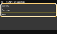Asteriskit (*)Asetuksia, joissa on asteriski (*) ei välttämättä näytetä käytettävän mallin, lisävarusteiden tai muiden asetusten mukaan. |