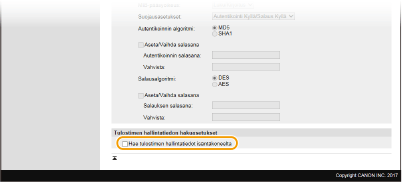 Valitse haluttu autentikointi- ja salausasetusten yhdistelmä vaihtoehdoista [Autentikointi Kyllä/Salaus Kyllä], [Autentikointi Kyllä/Salaus Ei] ja [Autentikointi Ei/Salaus Ei].