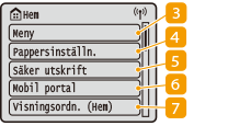 ![]() | <Meny><Funktionsinställn.>, <Preferenser>och många andra inställningar för enheten startas med den här knappen. Inställningsmenylista <Pappersinställn.>Den här knappen används för att ange format och typ för papperet som är påfyllt i papperslådan eller universalfacket. Ange pappersformat och -typ <Säker utskrift>Använd den här funktionen för att skriva ut ett säkert dokument. Skriva ut ett dokument som kräver en PIN-kod (säker utskrift) <Mobil portal>Använd denna knapp för att upprätta en anslutning till en mobil enhet. Ansluta med mobila enheter <Visningsordn. (Hem)>Här kan du ändra i vilken ordning som Hem-skärmknapparna visas. Anpassa skärmen Hem |