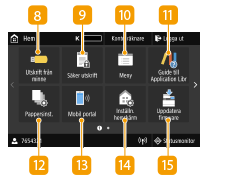 ![]() | <Utskrift från minne>Skriver ut filer som har sparats på ett USB-minne. Skriva ut från ett USB-minne (minnesenhetsutskrift) <Säker utskrift>Använd den här funktionen för att skriva ut ett säkert dokument. Skriva ut ett dokument som kräver en PIN-kod (säker utskrift) <Meny><Funktionsinställningar>, <Preferenser>och många andra inställningar för enheten startas med den här knappen. Inställningsmenylista <Guide till Application Libr>Visar en beskrivning av Application Library (Programbibliotek). <Pappersinst.>Den här knappen används för att ange format och typ för papperet som är påfyllt i papperslådan eller universalfacket. Ange pappersformat och -typ <Mobil portal>Använd denna knapp för att upprätta en anslutning till en mobil enhet. Ansluta med mobila enheter <Inställn. hemskärm>Här kan du ändra i vilken ordning som Hem-skärmknapparna visas. Anpassa skärmen Hem <Uppdatera firmware>Det går att uppdatera firmware via Internet. Uppdatera firmware |