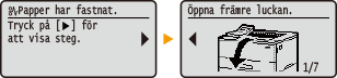 I vissa fall visas anvisningar om hur du ska åtgärda felet. Följ anvisningarna på skärmen för att lösa problemet. Skärmen som visas när ett pappersstopp inträffar visas nedan som ett exempel.