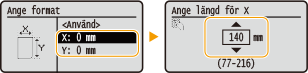 2 | Ange längden på <X>-sidan och <Y>-sidan. Pekskärmsmodell Välj <X> eller <Y> och ange längden på respektive sida med sifferknapparna. Om du registrerar ett pappersformat som du ofta använder på knapparna <S1> till <S3> kan du välja dessa med en enkel knapptryckning. Registrera ett eget pappersformatSvartvit LCD-modell |