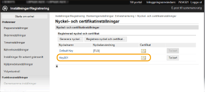 En nyckel och ett certifikat kan inte raderas om det används för något syfte, t.ex. när "[TLS]" eller "[IEEE 802.1X]" visas under [Nyckelanvändning]. Inaktivera i så fall funktionen eller byt ut nyckel och certifikat innan du raderar dem.