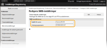 Arbetsgruppsnamn är ett namn för att gruppera flera datorer så att grundläggande nätverksfunktioner, till exempel fildelning, blir tillgängliga i ett Windows-nätverk. Ange arbetsgruppsnamnet för att identifiera den grupp som enheten hör till.