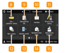 Po stisknutí tohoto tlačítka můžete zkontrolovat stav tisku, zobrazit historii používání nebo síťová nastavení, jako je adresa IP zařízení. Můžete také ověřit stav zařízení, např. zbývající množství papíru a zbývající množství toneru v kazetách nebo chyby, ke kterým případně došlo. Obrazovka <Monitor stavu>