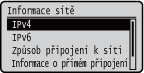 Zobrazuje nastavení sítě, jako je adresa IP zařízení, a stav, například komunikací v bezdrátové síti LAN.