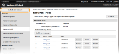 V závislosti na položkách nastavení, které byly změněny, může být nutné aktivovat změny prostřednictvím restartování zařízení. V této části je popsáno, jak stroj restartovat.