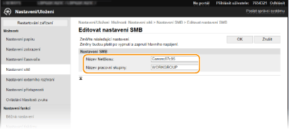 SMB (Server Message Block) představuje protokol ke sdílení zdrojů, například souborů a tiskáren, mezi několika zařízeními v síti. Budete ho potřebovat při konfiguraci zařízení jako sdílené tiskárny v síti SMB. Podle používané sítě může být nutné nastavit název systému NetBIOS a pracovní skupiny.