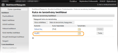 Ha a kulcsot és a tanúsítványt valamelyik funkció használja, ha például a „[TLS]” vagy az „[IEEE 802.1X]” felirat látható a [Kulcs használata] mezőben, a kulcs és a tanúsítvány nem törölhető. Ebben az esetben a kulcs törlése előtt ki kell kapcsolni a funkciót, vagy le kell cserélni a kulcsot és a tanúsítványt.