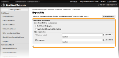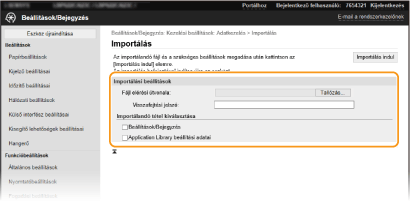 A készülék beállításai a számítógépre menthetők (exportálhatók). A számítógépre mentett adatok szintén bejegyezhetők a készülékre (importálás). A készülékről exportált adatokat egy másik, ugyanolyan típusú készülékre importálhatja. Így egy adott beállításkészletet akár több különböző készüléken is lehet alkalmazni. Ezeknek a funkcióknak a használatához rendszerkezelői módban kell bejelentkeznie.