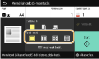 PDF-fájl esetén 9 vagy 16 oldalnyi képadatot nyomtathat egy papírlap egy oldalára az <N-ről 1-re> lehetőség <PDF részl.-nek beáll.> pontban történő kiválasztásával.