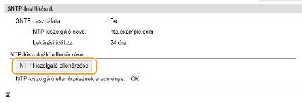 [Hálózati beállítások] [NTP-kiszolgáló ellenőrzése] pontokra az [SNTP-beállítások] között. Ha megfelelő kapcsolat jött létre, akkor az alábbi eredmény jelenik meg. Ezzel a művelettel nem állítja át a rendszeridőt.