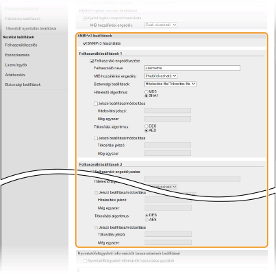 Az egyszerű hálózatfelügyeleti protokoll (SNMP) olyan protokoll, amellyel egy felügyeleti információs bázis (MIB) alapján figyelhetők és vezérelhetők egy hálózat kommunikációs eszközei. A készülék az SNMPv1 és a megerősített biztonságú SNMPv3 protokollt támogatja. Amikor dokumentumokat nyomtat vagy a Távoli felhasználói felületet használja, a számítógépről ellenőrizheti a készülék állapotát. Engedélyezheti az SNMPv1 vagy a SNMPv3 protokollt, illetve mindkettőt egyszerre. A hálózati környezetnek és a felhasználási céljának megfelelően adja meg mindegyik verzió beállításait.