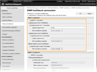 A Kijelölt logikai csoport egy előre beállított csoport, amely kizárólag a Canon szoftvert (például iW Management Console) használó rendszergazdáknak készült. A Kijelölt logikai csoport használatához jelölje be a jelölőnégyzetet, és adja meg a [MIB hozzáférési engedély] értékét. Ha nincs szüksége a kijelölt logikai csoportra, akkor törölje a jelet a jelölőnégyzetből.