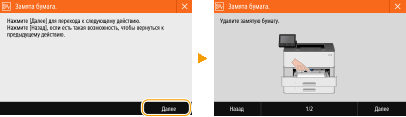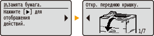 В некоторых случаях при возникновении ошибки отображаются инструкции по ее устранению. Следуйте указаниям на экране для решения проблемы. Экран отображается при возникновении замятия бумаги, как показано на приведенном ниже примере.