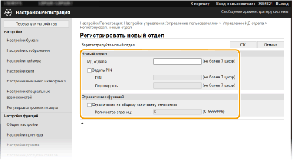 Управлять доступом к аппарату можно с помощью разных идентификаторов пользователей и групп. При попытке использования аппарата с включенной функцией определения имени подразделения на экране появляется окно входа в систему и пользователь должен ввести правильное имя подразделения и PIN-код. Если включено управление именами подразделений, использование таких функций, как печать, записывается для каждого имени подразделения. Чтобы настроить функцию управления ИД отделов, нужно при необходимости зарегистрировать ИД отделов и включить функцию управления ИД отделов. Для использования функции управления именем подразделения для операций на компьютере необходимо настроить дополнительные параметры.