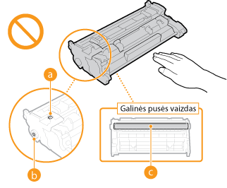 Nenaudokite suklastotų dažomųjų miltelių kasečiųAtkreipkite dėmesį, kad rinkoje gali būti parduodamos suklastotos „Canon“ dažomųjų miltelių kasetės. Naudojant suklastotą dažomųjų miltelių kasetę, spaudiniai gali būti prastos kokybės arba gali prastai veikti aparatas. „Canon“ neatsako už jokius veiklos sutrikimus, nelaimingus atsitikimus ar žalą, patirtą naudojant suklastotas dažomųjų miltelių kasetes.