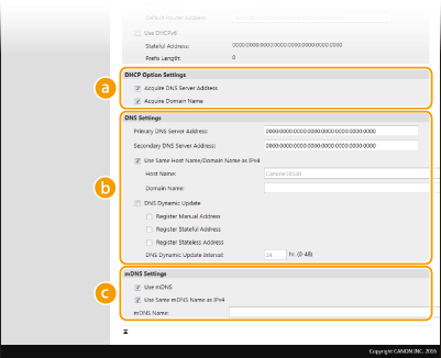 Pažymėkite šį žymės langelį, kad pasikeitus aparato IP adresui būtų dinamiškai naujinami DNS įrašai. Norėdami nurodyti adresų, kuriuos norite užregistruoti DNS serveryje, tipą (-us), pažymėkite žymės langelį [Register Manual Address], [Register Stateful Address] arba [Register Stateless Address]. Norėdami nurodyti laikotarpį tarp naujinimų, teksto lauke [DNS Dynamic Update Interval] įveskite laiką valandomis.