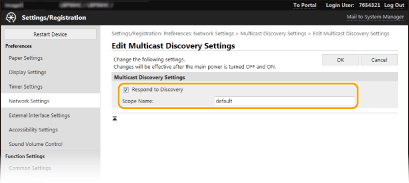 2 | Märkige ruut [Respond to Discovery] ja määrake nõutavad sätted. ![]() [Respond to Discovery] Valige ruut, et seadistada seade vastama seadmehaldustarkvara multisaate tuvastamispakettidele ja lubama seadmehaldustarkvara jälgimist. ![]() Multisaate tuvastamise pordinumbri muutmiseks vt teemat Pordinumbrite muutmine. [Scope Name] Seadme kaasamiseks kindlasse ulatusse sisestage ulatuse nime tähemärgid. |