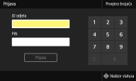 Ako se omogući upravljanje ID-om odjela ili su omogućeni ID-ovi upravitelja sustava, prije korištenja uređaja morate se prijaviti. Kad se pojavi zaslon za prijavu, poslužite se postupkom u nastavku za unos ID-a odjela i PIN-a.