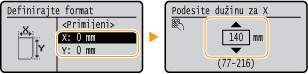 Veličine papira koje su registrirane u gornjem postupku mogu se pozivati kada se na zaslonu za odabir formata papira za ladicu papira ili višenamjensku ladicu odabere <Po mjeri>.