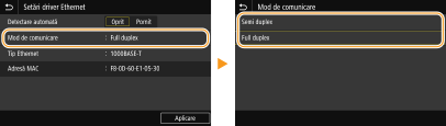 Trimite şi primeşte informaţii de comunicare în mod alternativ. Selectaţi când aparatul este conectat la un dispozitiv de reţea folosind half duplex. <Full duplex>