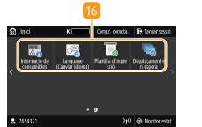 Premeu-la per comprovar l'estat d'impressió, per veure l'historial d'ús o per visualitzar les opcions de xarxa, com ara l'adreça IP de l'equip. També podeu comprovar l'estat de l'equip, com ara la quantitat de paper i de cartutxos de tòner que queda o si s'ha produït algun error. Pantalla <Monitor d'estat>