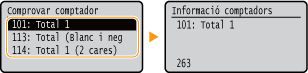 Podeu comprovar el nombre total de pàgines impreses per l'equip. El nombre d'impressions inclou les impressions fetes des d'un dispositiu de memòria i la llista, així com les impressions de dades d'ordinadors.