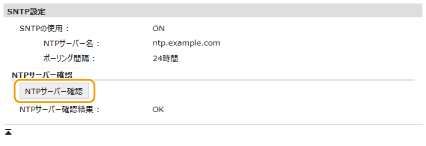 NTP/SNTPサーバーと通信できるか確認するには登録したサーバーとの通信状況を確認するときは、[設定/登録]  [ネットワーク設定]  [SNTP設定]の[NTPサーバー確認]をクリックします。正しく接続されているときは下の画面のように表示されます(ただし、このときは通信状況を確認するだけで、時刻合わせは行いません)。 |