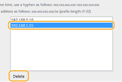 เมื่อเลือก [Reject] สำหรับตัวกรองขาออก ไม่สามารถกรองแพคเก็ตแบบหลายผู้รับและแบบกระจายข้อมูลขาออกได้ การลบที่อยู่ IP ออกจากข้อยกเว้น เลือกที่อยู่ IP และคลิก [Delete] ![]() | ||||||||||||||